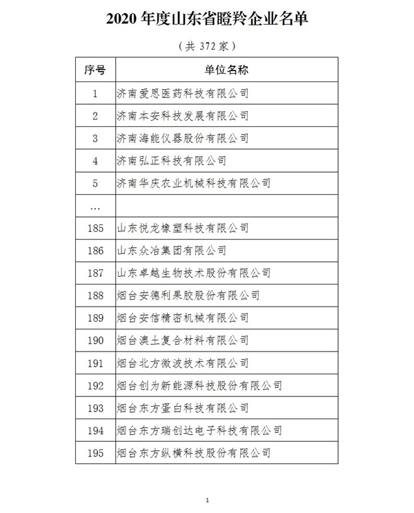 12月15日,山东省工业和信息化厅公布了2020年度山东省瞪羚、独角兽企业名单,山东悦龙橡塑科技股份有限公司等51家烟台企业上榜省级瞪羚企业、列全省第二。至此,烟台已拥有省瞪羚企业97家,均居全省第二位。