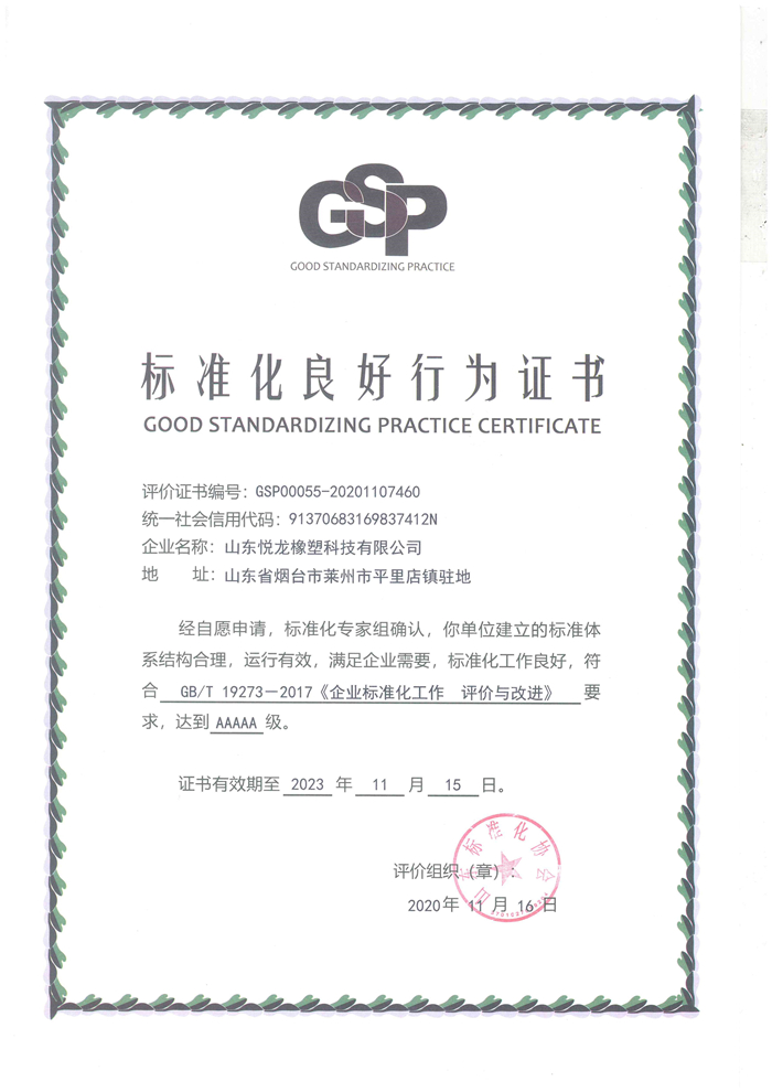 山东悦龙橡塑科技股份有限公司将以此次获得5A级“标准化良好行为企业”为契机,建立结构合理、层次分明、系统及安全的企业标准体系,探索出一套适合企业自身发展特点的企业标准化管理模式,严格实行标准化管理,不断参与国际、国家和行业标准化活动,提高企业标准化能力和水平,更助力行业高质量发展。