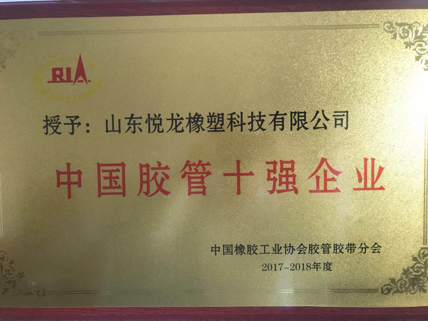 烟台泰悦流体科技母公司山东悦龙橡塑科技股份有限公司荣获2018年度“中国胶管十强”