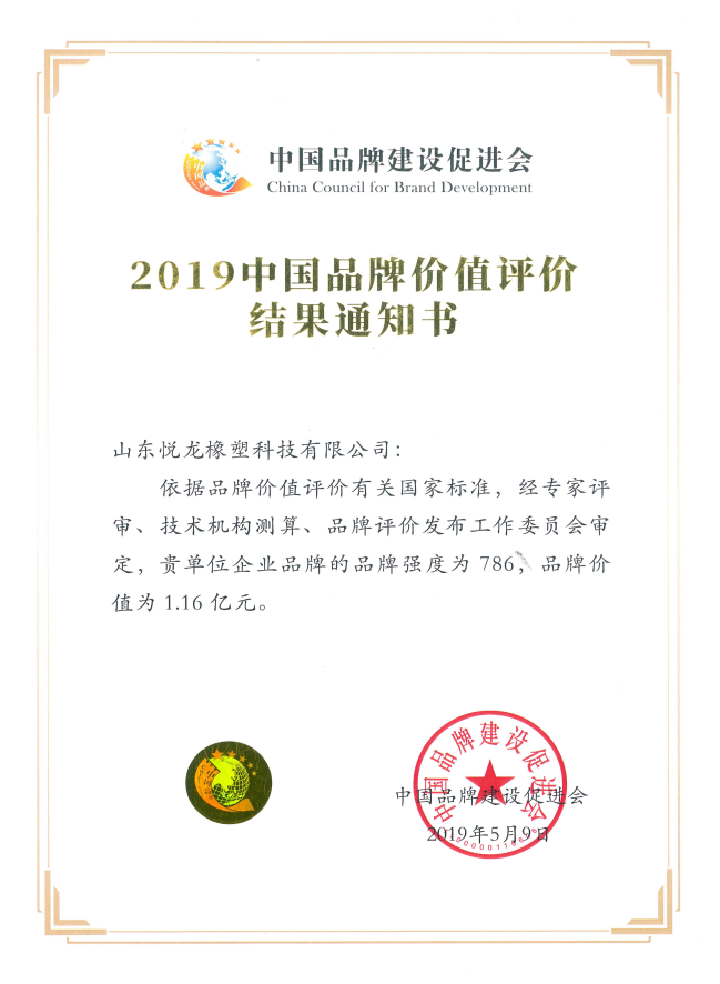 山东悦龙橡塑科技股份有限公司 2019中国品牌价值评价结果公布2019年5月9日,由新华社、经济日报社、中国国际贸易促进委员会、中国品牌建设促进会、中国资产评估协会等单位联合举办的“2019中国品牌价值评价信息发布”活动在上海举行。依据国际标准、国家标准和相关评价细则,遵循科学、公正、公开、公认的原则,本次品牌价值评价数量达1293家,现场发布品牌价值数量为598个,发布的总品...14 2019-07