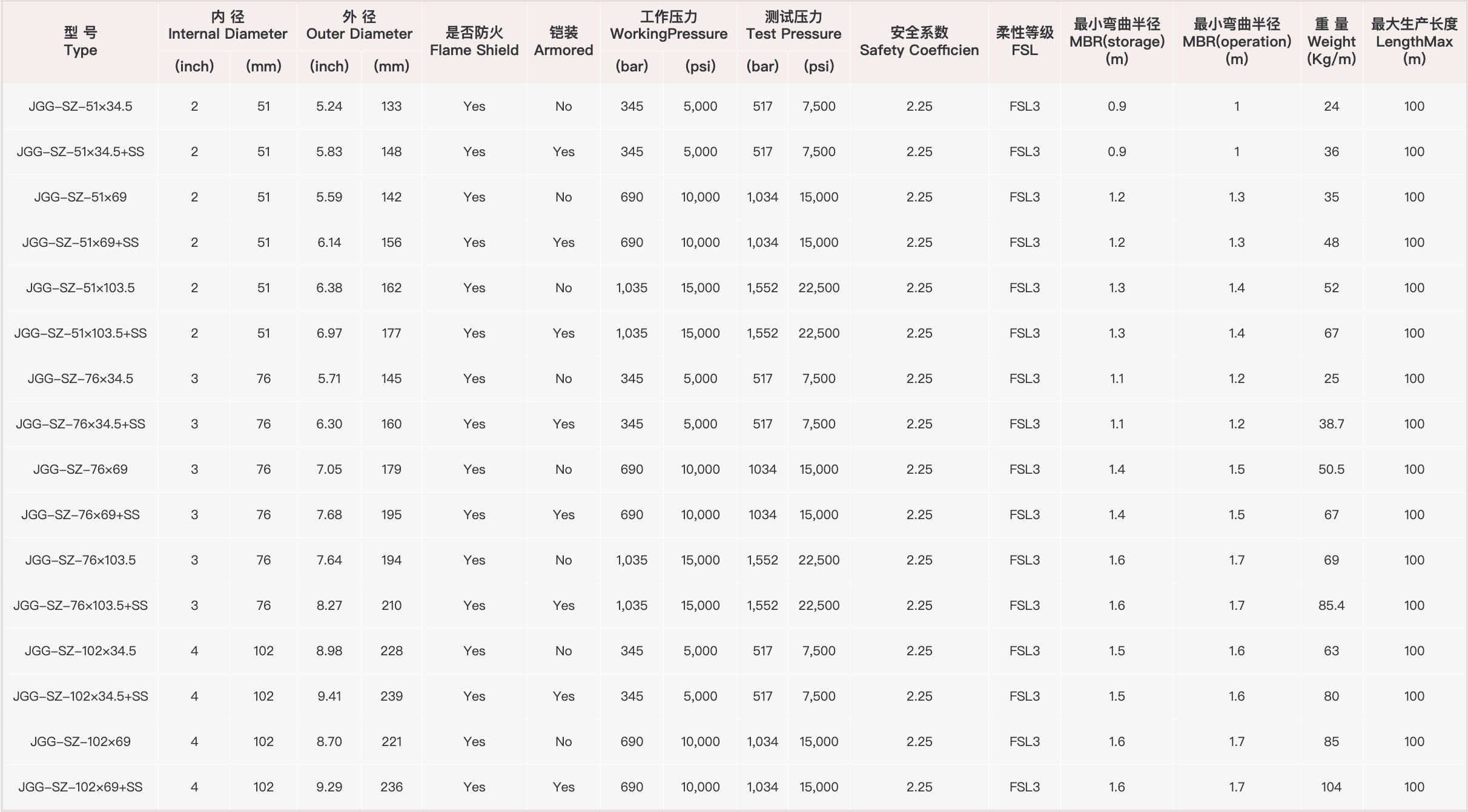 • 生产长度公差:6.4米及以下± 64 mm, 大于6.4米的软管± 1%