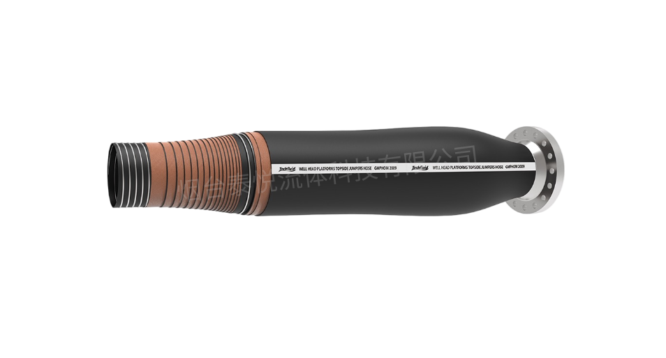 采用不锈钢套骨架作为内衬层;采用以氢化丁腈橡胶为主体的防硫化氢、耐油、耐腐蚀、耐高温、耐气体渗透的合成橡胶为内胶密封层;高强力织物布为内缓冲层和外防护层;以高强度钢丝绳作为承压骨架材料;玻璃纤维布作为阻燃隔热层;采用以氯丁橡胶为主体的阻燃、耐磨、耐油、耐臭氧老化、耐紫外线、适用于海洋环境的合成橡胶为外保护层。