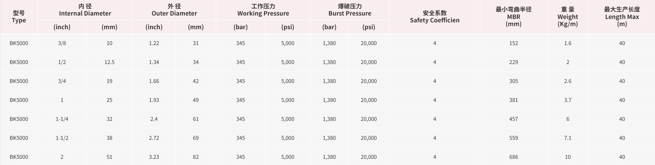 • 产品用途: BOP 软管主要用于防喷器液压控制,操作压力5000PSI,并且可直接暴露在704℃火焰里超